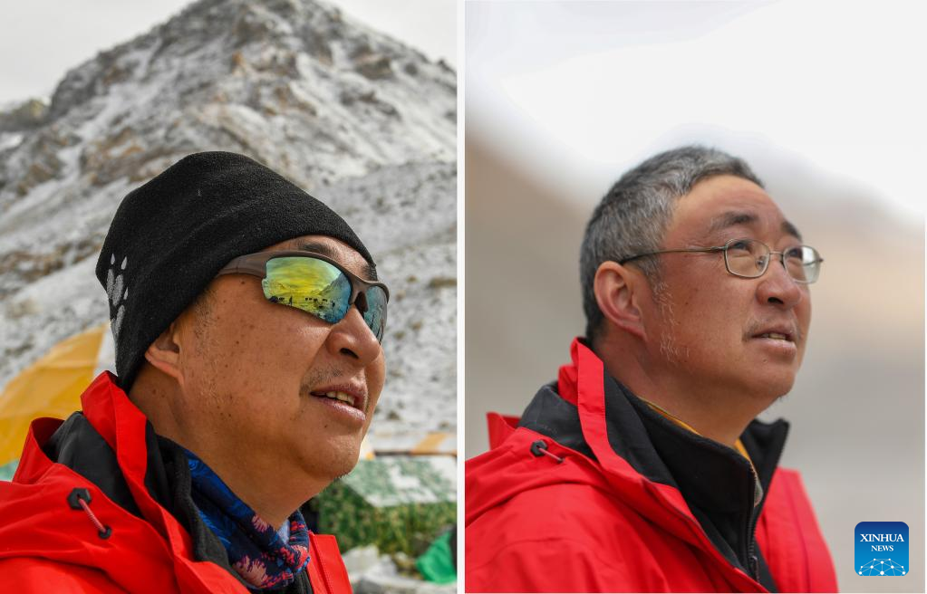 Kang Shichang (front) checks the working materials on Mount Qomolangma, May 6, 2022. The new comprehensive scientific expedition on Mount Qomolangma, as part of China's second scientific research survey of the Qinghai-Tibet Plateau, is the country's first scientific research above an altitude of 8,000 meters on the peak.