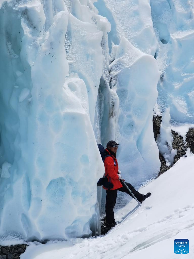 Photo taken with a mobile phone shows a member of the glacier and pollutant research team walking past the East Rongbuk glacier on Mount Qomolangma, May 6, 2022. The new comprehensive scientific expedition on Mount Qomolangma, as part of China's second scientific research survey of the Qinghai-Tibet Plateau, is the country's first scientific research above an altitude of 8,000 meters on the peak.