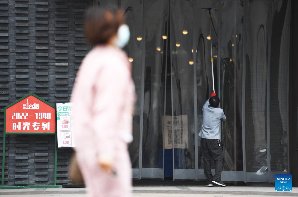 A staff member does cleaning in front of a shopping mall in Zhengzhou, central China's Henan Province, May 11, 2022. Zhengzhou has resumed work and production from May 11 in the city other than closed-off management areas and restrictive control areas. (Xinhua/Zhang Haoran)