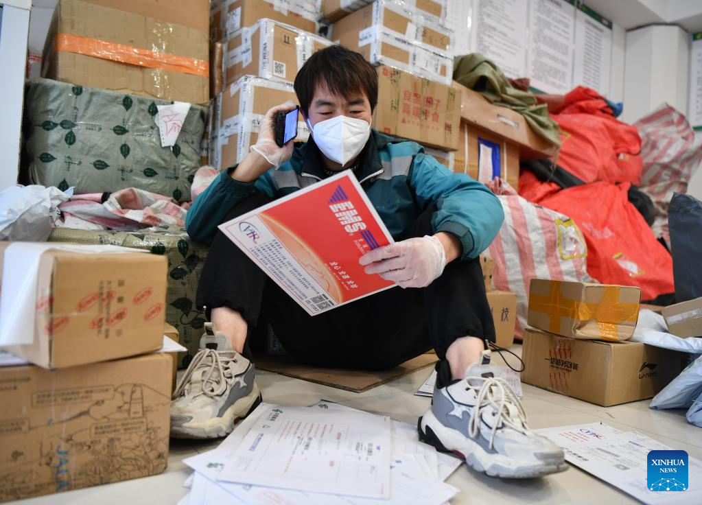 A staff member of delivery service contacts a customer at a distribution center in Zhengzhou, central China's Henan Province, May 10, 2022. Zhengzhou has resumed work and production from May 11 in the city other than closed-off management areas and restrictive control areas. (Xinhua/Li Jianan)