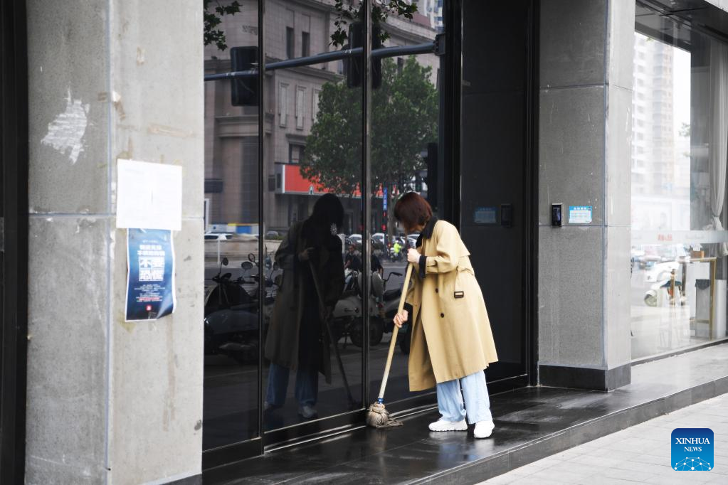 A staff member of a shop does cleaning for reopening in Zhengzhou, central China's Henan Province, May 11, 2022. Zhengzhou has resumed work and production from May 11 in the city other than closed-off management areas and restrictive control areas. (Xinhua/Zhang Haoran)