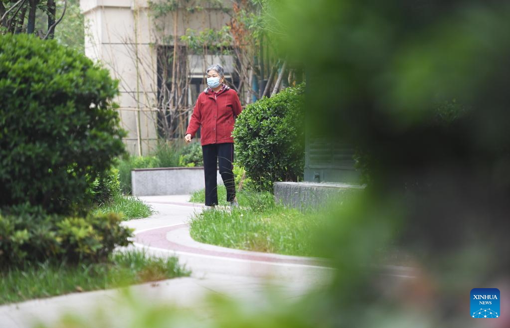 A citizen takes a walk at a small garden in Zhengzhou, central China's Henan Province, May 11, 2022. Zhengzhou has resumed work and production from May 11 in the city other than closed-off management areas and restrictive control areas. (Xinhua/Zhang Haoran)