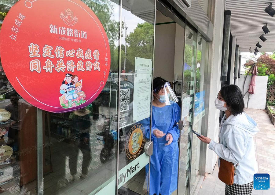 A customer scans the QR code before entering a grocery store in Jiading District of east China's Shanghai, May 9, 2022. (Xinhua/Li He)