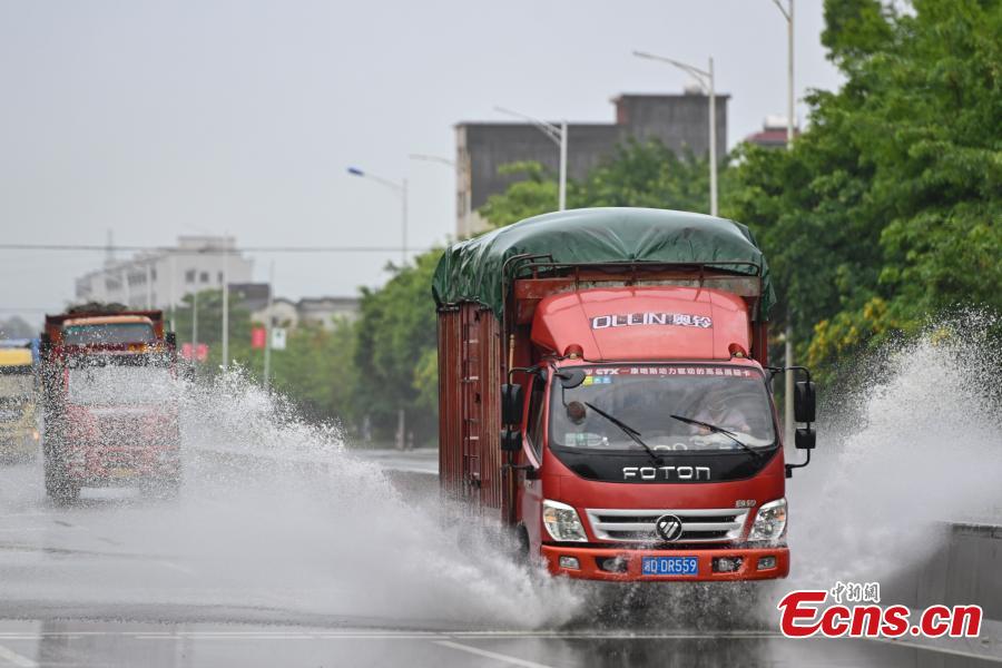 Trucks drive on a waterlogged road in Conghua district, Guangzhou, south China's Guangdong Province, May 11, 2022. (Photo: China News Service/Chen Wenmin)
