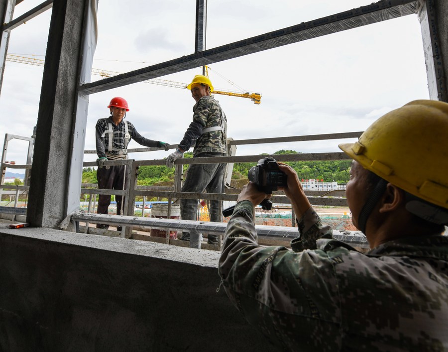 He Chuan (R) uses a camera to record his colleagues working at a construction site in Dazhou, southwest China's Sichuan Province, April 29, 2022. (Xinhua/Wang Xi)