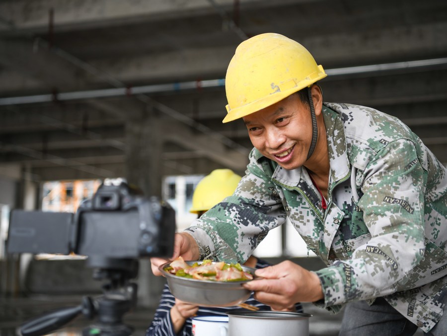 He Chuan shows followers his dishes during lunch break in a vlog recorded at a construction site in Dazhou, southwest China's Sichuan Province, April 29, 2022. (Xinhua/Wang Xi)