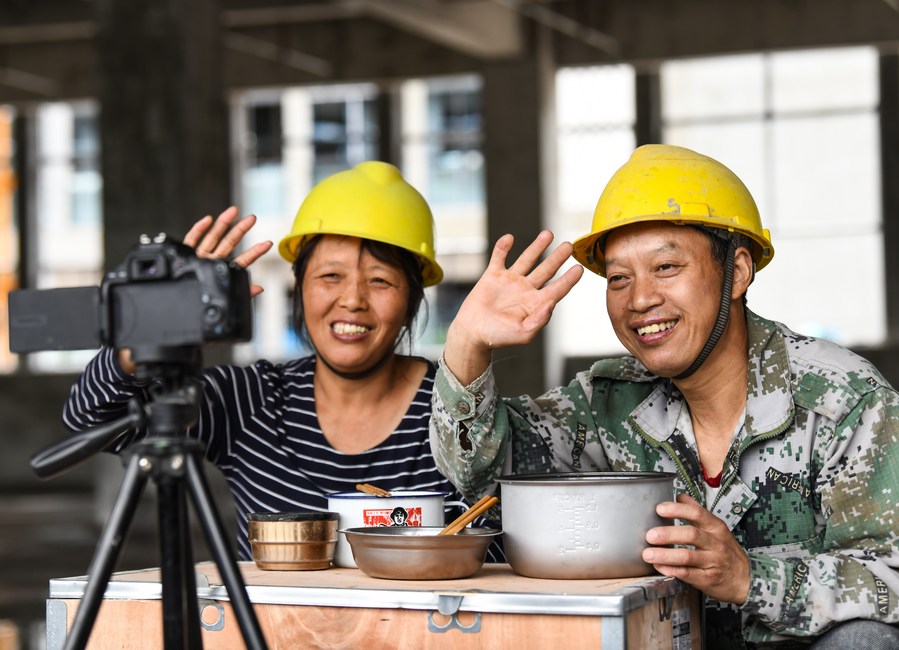 He Chuan and his wife Tang Wenshu wave goodbye to their audiences at the end of an online show held at a building under construction in Dazhou, southwest China's Sichuan Province, April 29, 2022. (Xinhua/Wang Xi)