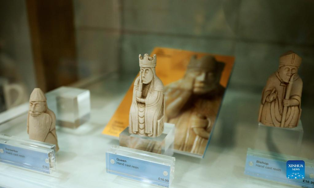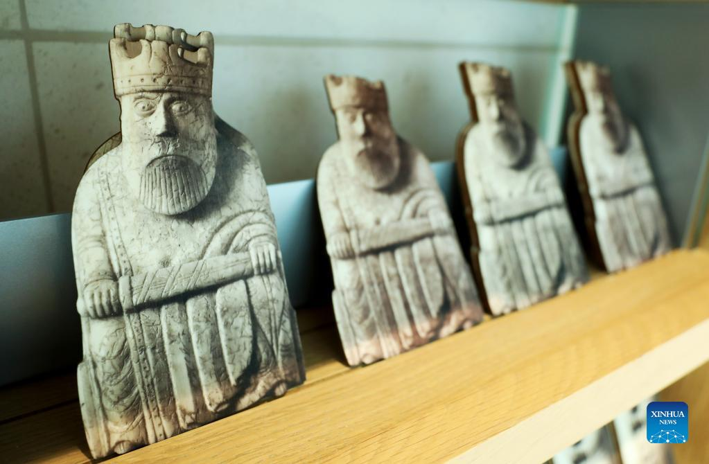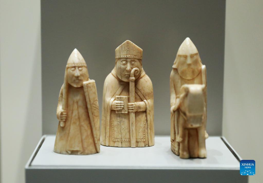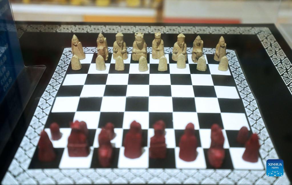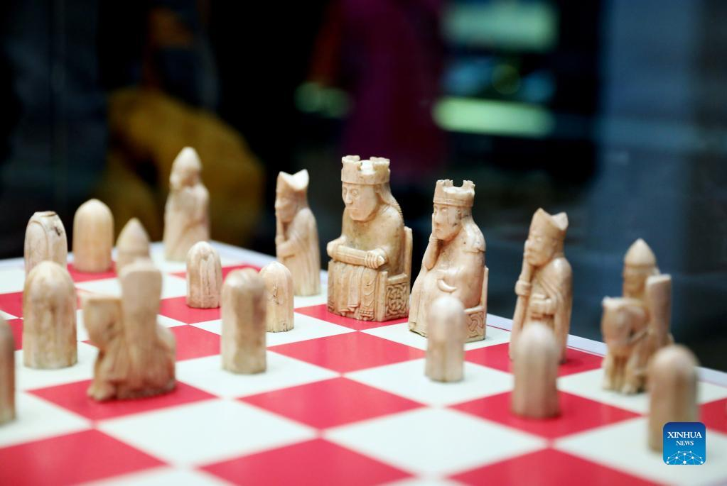 Photo taken on May 11, 2022 shows replicas of the Lewis Chessmen in the British Museum in London, Britain. The Lewis Chessmen are among the most popular collections in the British Museum. Discovered on the Isle of Lewis of Scotland in 1831, the medieval chess pieces were made of walrus ivory. (Xinhua/Li Ying)