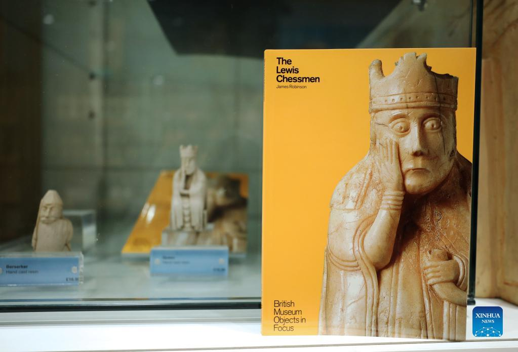 Photo taken on May 11, 2022 shows a book and replicas of the Lewis Chessmen in the British Museum in London, Britain. The Lewis Chessmen are among the most popular collections in the British Museum. Discovered on the Isle of Lewis of Scotland in 1831, the medieval chess pieces were made of walrus ivory. (Xinhua/Li Ying)