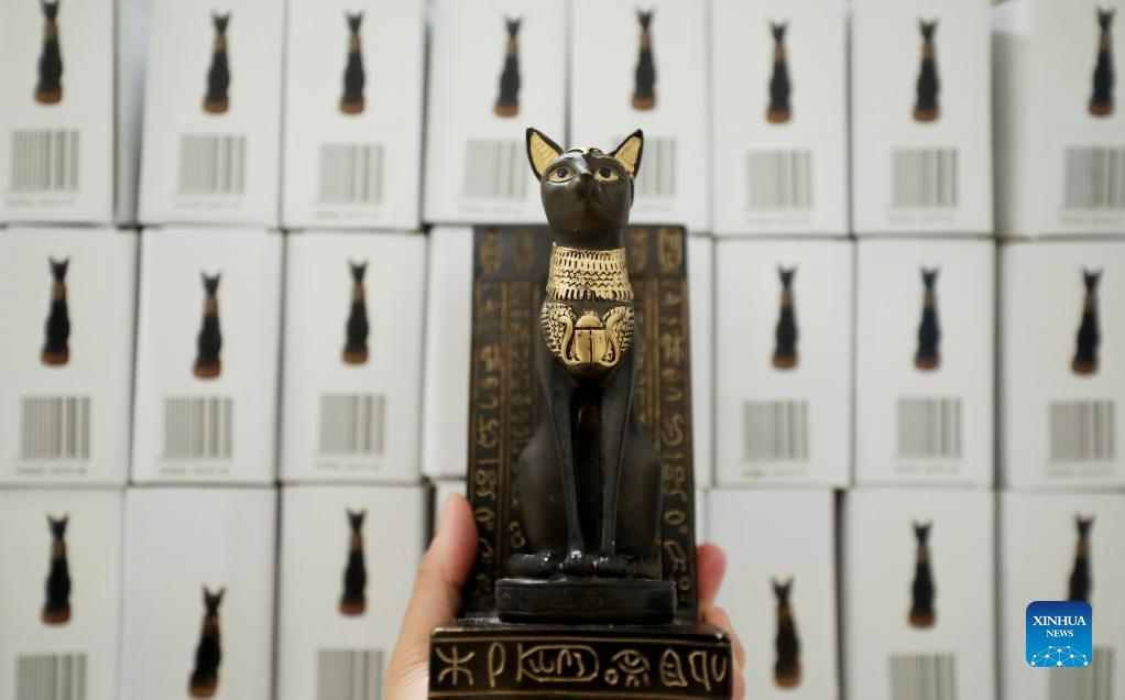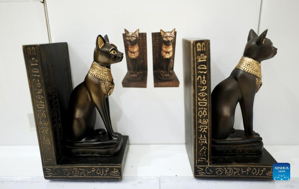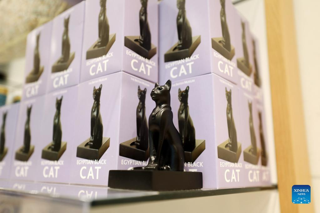 Photo taken on May 11, 2022 shows replicas of the Gayer-Anderson cat in the British Museum in London, Britain. The Gayer-Anderson cat is a bronze figure depicting one form of the goddess Bastet. The cat dates from the Late Period of ancient Egypt around 600 BC. It's named after Major Robert Grenville Gayer-Anderson, who donated the statue to the British Museum in 1939. (Xinhua/Li Ying)