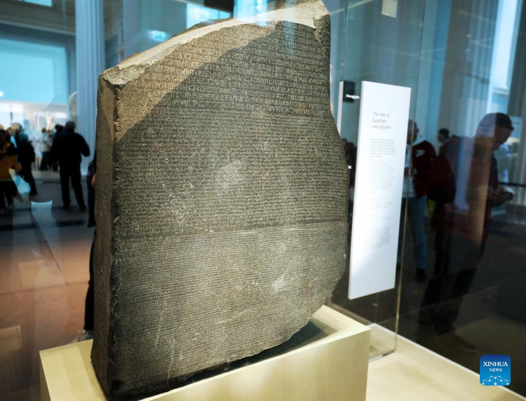 Photo taken on May 11, 2022 shows the Rosetta Stone in the British Museum in London, Britain. The Rosetta Stone is one of the most famous objects in the British Museum. The Stone is a broken part of a bigger stone slab. It has a message carved into it, written in three types of writing. It was an important clue that helped experts learn to read Egyptian hieroglyphs (a writing system that used pictures as signs). (Xinhua/Li Ying)