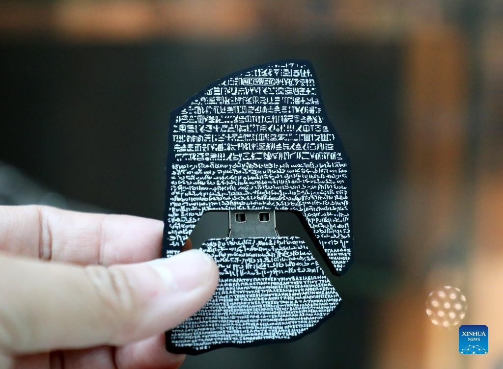 Photo taken on May 11, 2022 shows a Rosetta Stone flash disk in the British Museum in London, Britain. The Rosetta Stone is one of the most famous objects in the British Museum. The Stone is a broken part of a bigger stone slab. It has a message carved into it, written in three types of writing. It was an important clue that helped experts learn to read Egyptian hieroglyphs (a writing system that used pictures as signs). (Xinhua/Li Ying)