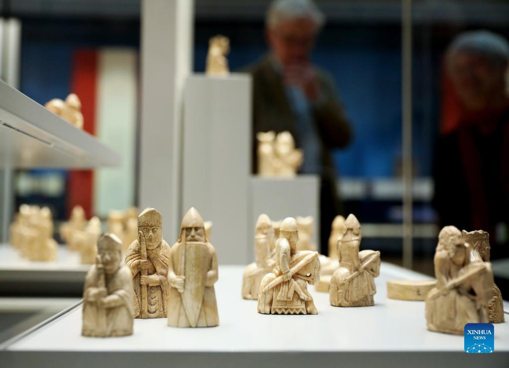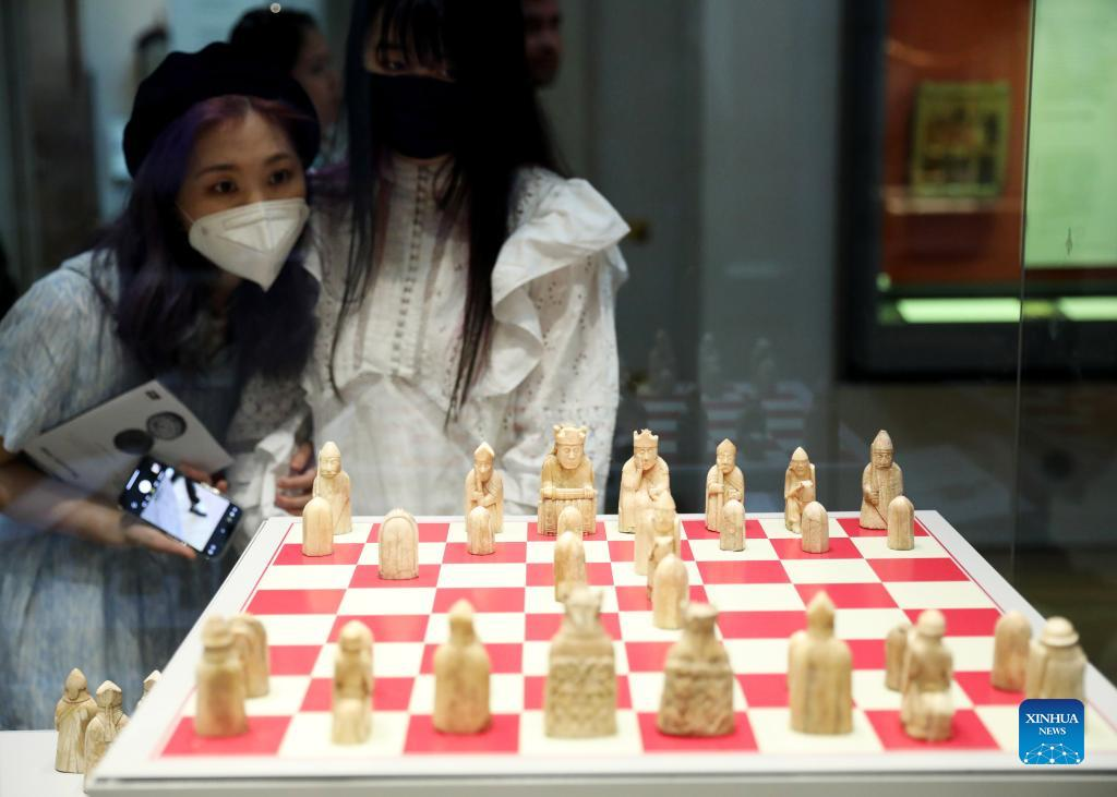 Visitors watch the Lewis Chessmen in the British Museum in London, Britain, on May 11, 2022. The Lewis Chessmen are among the most popular collections in the British Museum. Discovered on the Isle of Lewis of Scotland in 1831, the medieval chess pieces were made of walrus ivory. (Xinhua/Li Ying)