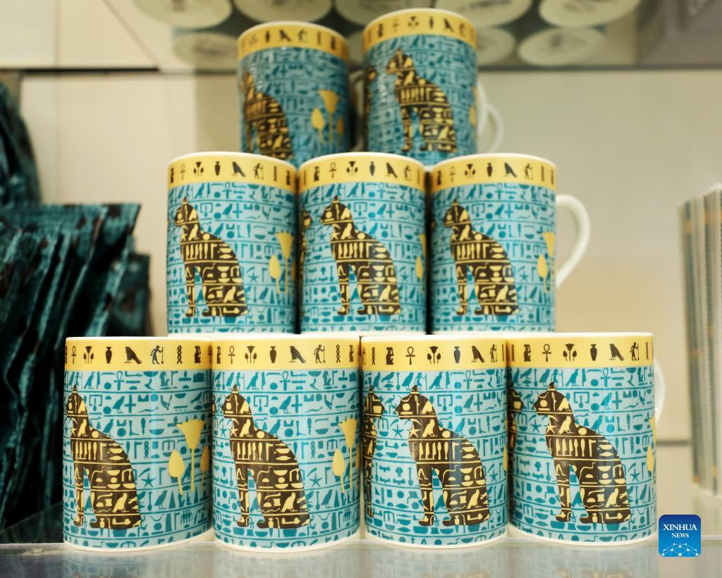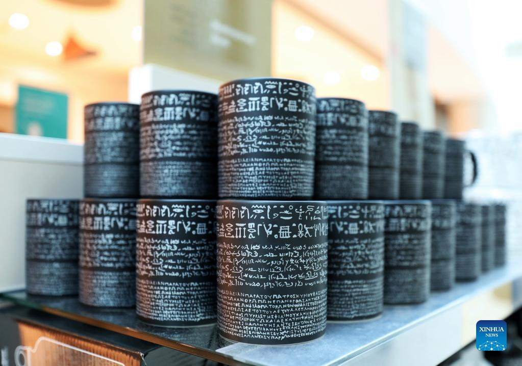 Photo taken on May 11, 2022 shows the Rosetta Stone mugs in the British Museum in London, Britain. The Rosetta Stone is one of the most famous objects in the British Museum. The Stone is a broken part of a bigger stone slab. It has a message carved into it, written in three types of writing. It was an important clue that helped experts learn to read Egyptian hieroglyphs (a writing system that used pictures as signs). (Xinhua/Li Ying)