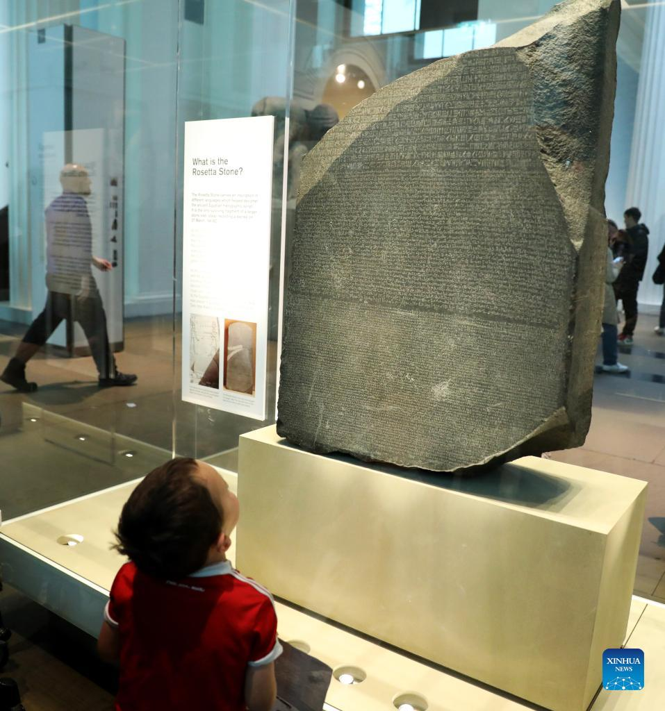 A boy watches the Rosetta Stone in the British Museum in London, Britain, on May 11, 2022. The Rosetta Stone is one of the most famous objects in the British Museum. The Stone is a broken part of a bigger stone slab. It has a message carved into it, written in three types of writing. It was an important clue that helped experts learn to read Egyptian hieroglyphs (a writing system that used pictures as signs). (Xinhua/Li Ying)