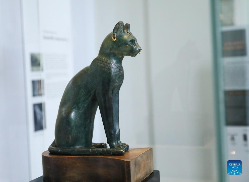 Photo taken on May 11, 2022 shows the Gayer-Anderson cat mugs in the British Museum in London, Britain. The Gayer-Anderson cat is a bronze figure depicting one form of the goddess Bastet. The cat dates from the Late Period of ancient Egypt around 600 BC. It's named after Major Robert Grenville Gayer-Anderson, who donated the statue to the British Museum in 1939. (Xinhua/Li Ying)