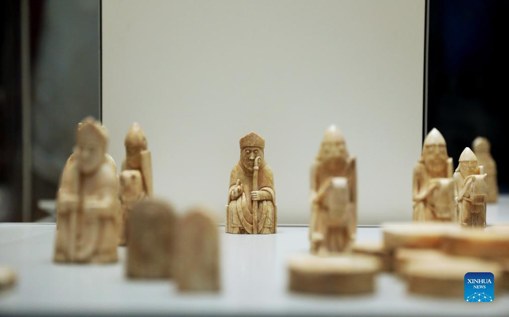 Photo taken on May 11, 2022 shows the Lewis Chessmen in the British Museum in London, Britain. The Lewis Chessmen are among the most popular collections in the British Museum. Discovered on the Isle of Lewis of Scotland in 1831, the medieval chess pieces were made of walrus ivory. (Xinhua/Li Ying)