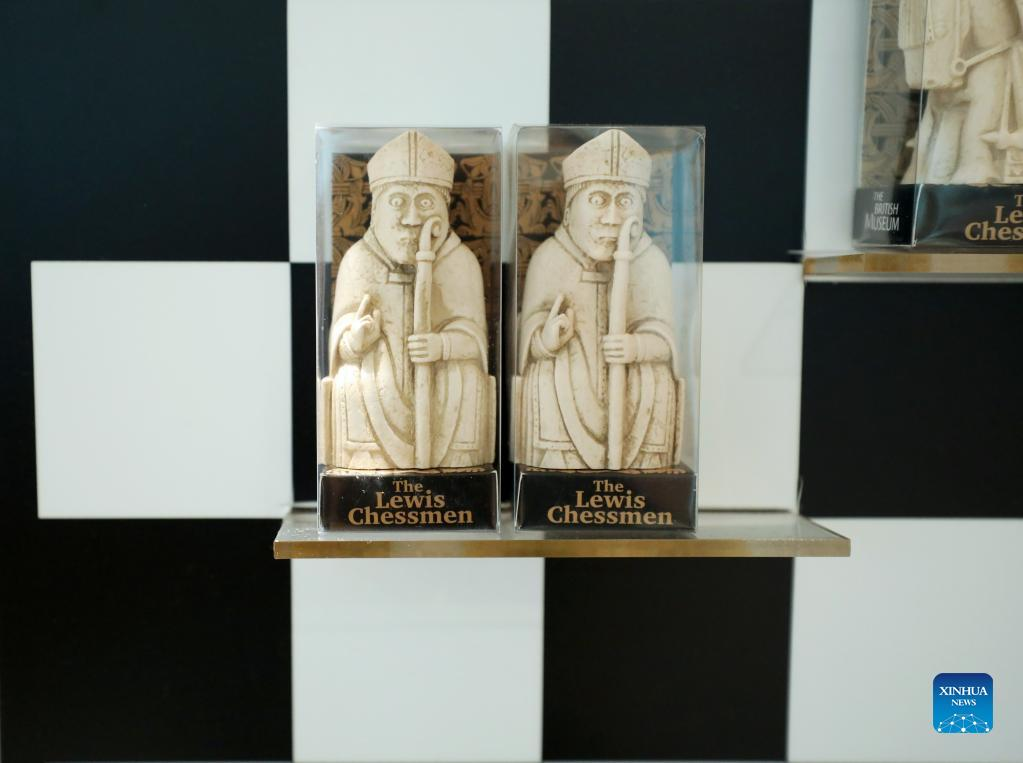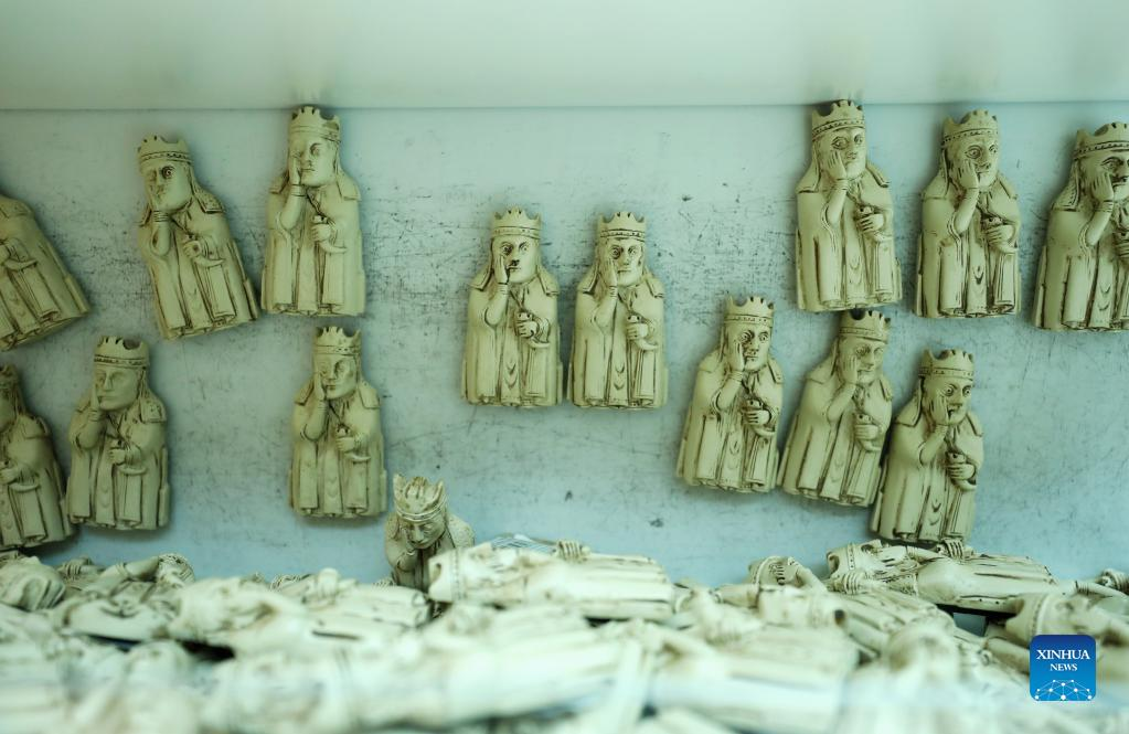 Photo taken on May 11, 2022 shows the Lewis Chessmen magnets in the British Museum in London, Britain. The Lewis Chessmen are among the most popular collections in the British Museum. Discovered on the Isle of Lewis of Scotland in 1831, the medieval chess pieces were made of walrus ivory. (Xinhua/Li Ying)