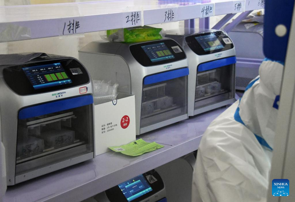 The newly installed lab, with a designed daily testing capacity of 100,000 tubes, covers the testing demand of various towns from Shunyi, as well as regions in other districts such as Miyun and Tongzhou. (Xinhua/Ren Chao)