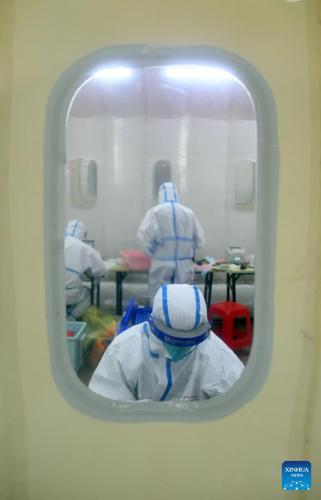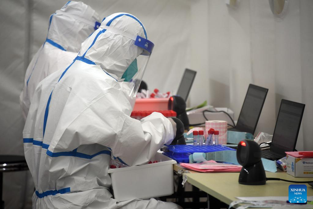 Staff members work at an inflatable COVID-19 testing lab in Shunyi District of Beijing, capital of China, May 12, 2022. An inflatable COVID-19 testing laboratory was put into use recently in Shunyi District.