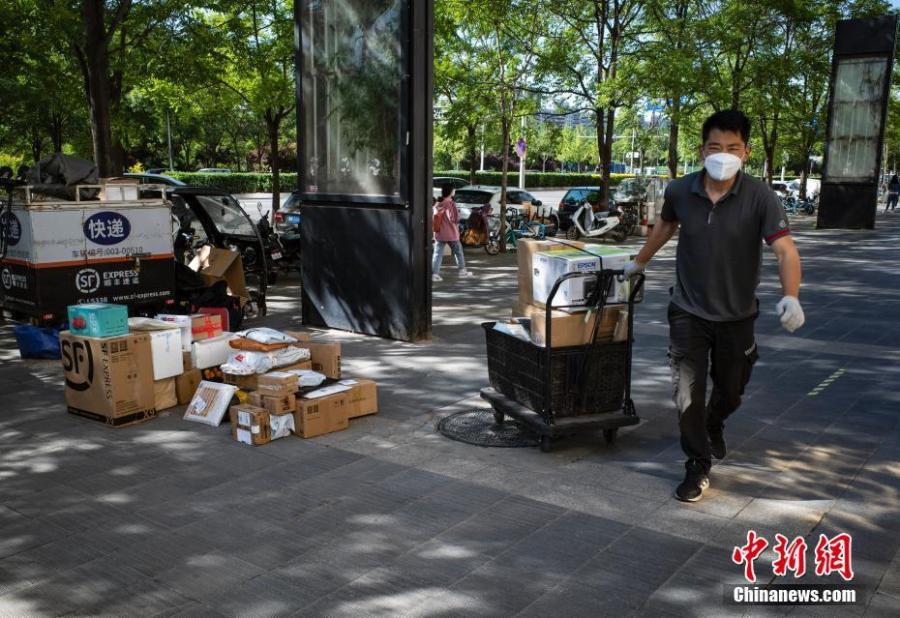A man delivers packages to a community in Chaoyang District, Beijing, May 13, 2022. (Photo: China News Service/Hou Yu)