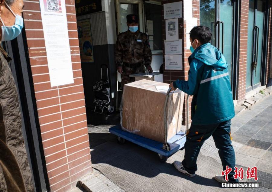 A delivery man carries a package to a community in Chaoyang district, Beijing, May 13, 2022. (Photo: China News Service/Hou Yu)