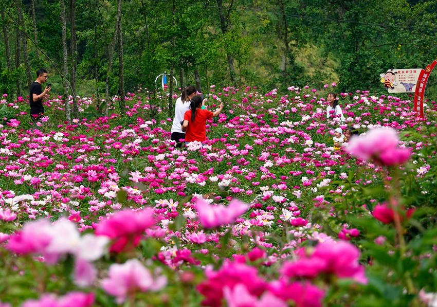 Visitors take photos with peonies in the Huangyangguan Tibetan township of Mianyang city, southwest China’s Sichuan Province. (Photo/Hu Yu)