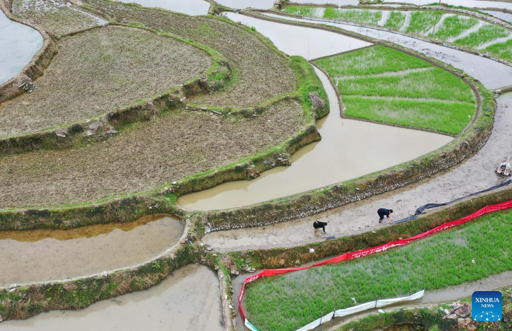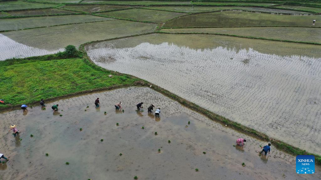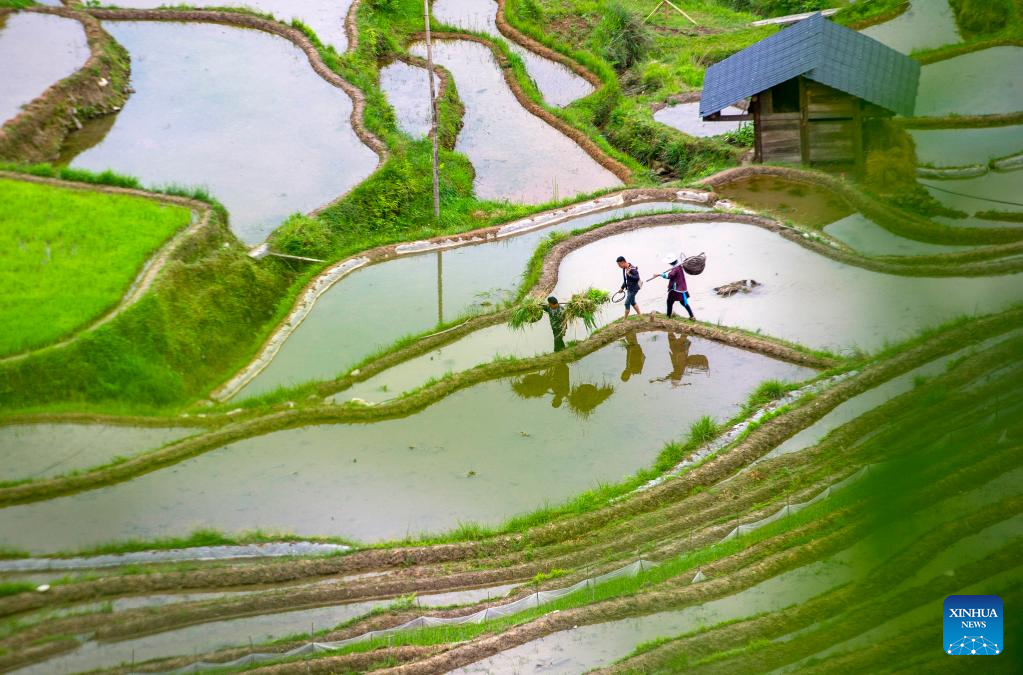 Farmers take care of seedlings in the field in Lijiagang Village of Wulingyuan District in Zhangjiajie, central China's Hunan Province, May 13, 2022. (Photo by Wu Yongbing/Xinhua)