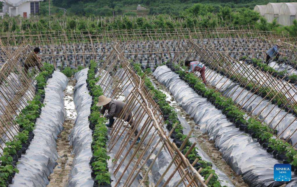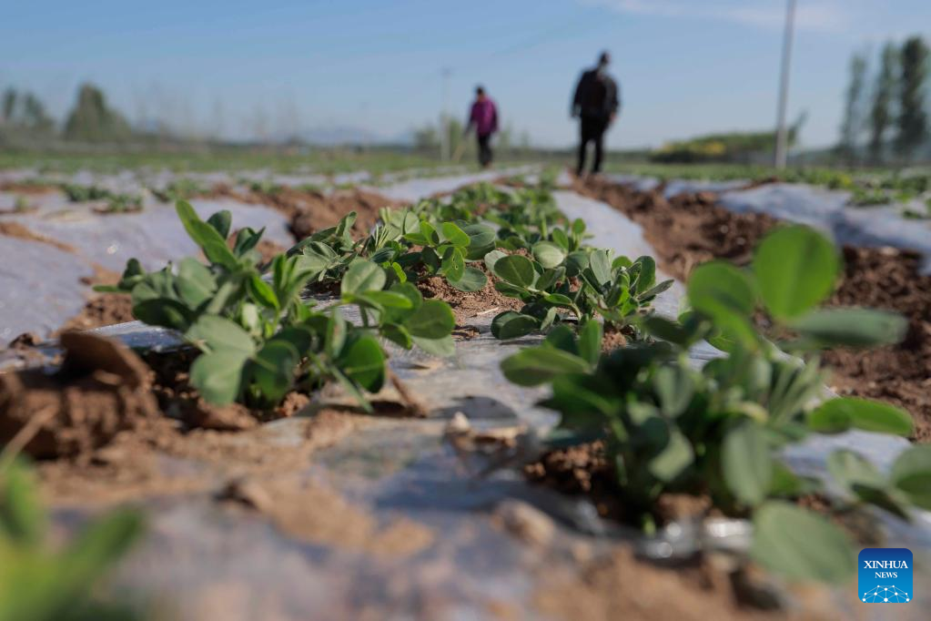 Farmers take care of peanut seedlings in the field in Quanshuitou Village of Zunhua, north China's Hebei Province, May 13, 2022. (Photo by Liu Mancang/Xinhua)