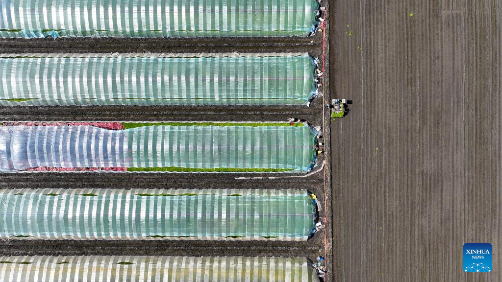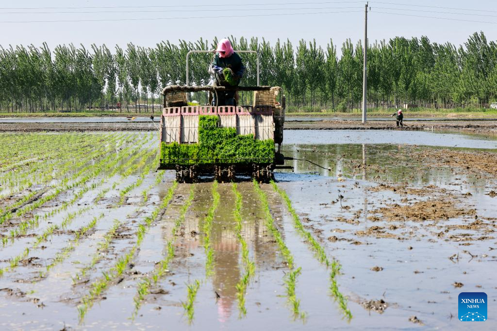 A farmer transplants rice seedlings in the field in Chahe Township of Fengnan District in Tangshan, north China's Hebei Province, May 13, 2022. (Photo by Li Xiuqing/Xinhua)