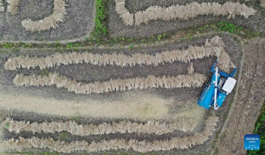 Aerial photo taken on May 11, 2022 shows a harvester reaping rapeseeds in Chongyang Village in Maliang Township of Xiangyang, central China's Hubei Province. (Photo by Chen Quanlin/Xinhua)