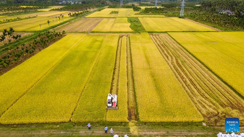Aerial photo taken on May 13, 2022 shows farmers reaping rices in Beishan Village of Boao Township in Qionghai, south China's Hainan Province. (Photo by Meng Zhongde/Xinhua)