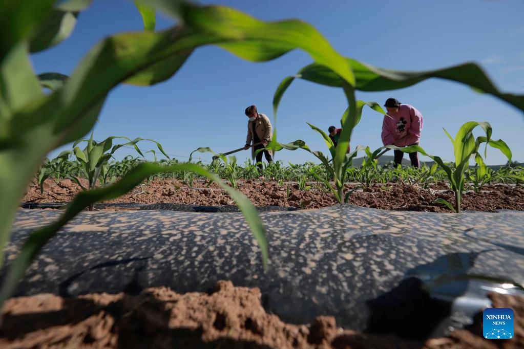 Farmers are busy in the corn field in Quanshuitou Village of Zunhua, north China's Hebei Province, May 13, 2022. (Photo by Liu Mancang/Xinhua)