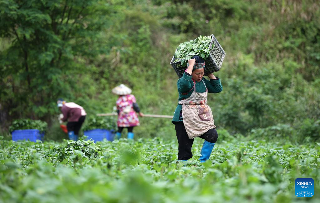 A farmer carries harvested vegetable in the field in Yangpai Village of Danzhai County, southwest China's Guizhou Province, May 13, 2022. (Photo by Huang Xiaohai/Xinhua)