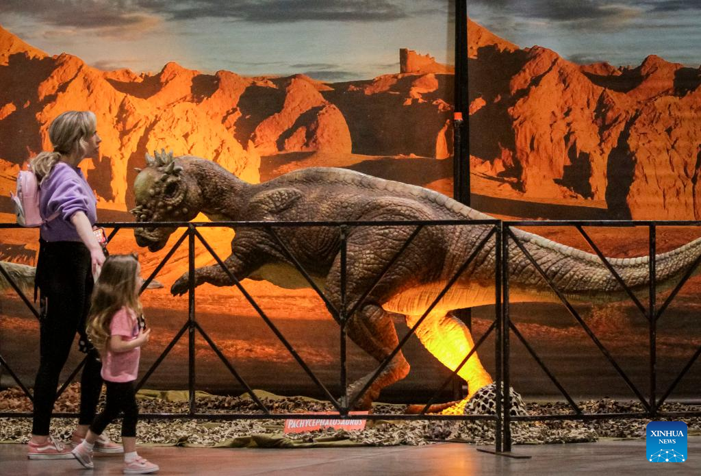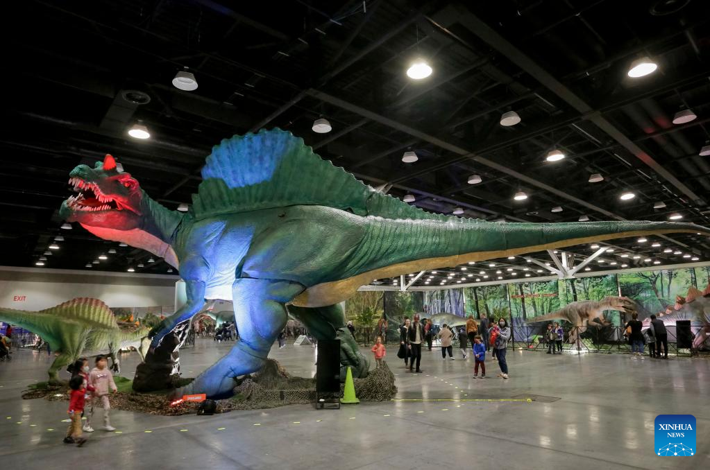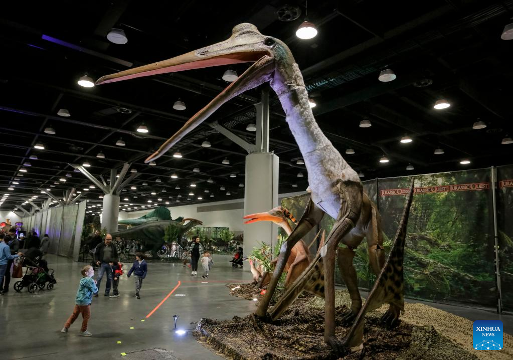 Life-size dinosaur models are displayed at the Jurassic Quest exhibition at Vancouver Convention Centre in Vancouver, British Columbia, Canada, on May 13, 2022. Featuring life-size animatronic dinosaurs, fossil displays and interactive shows, the exhibition will be held from May 13 to May 15 in Vancouver. (Photo by Liang Sen/Xinhua)