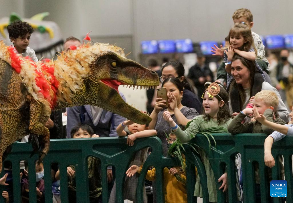People watch a raptor show at the Jurassic Quest exhibition at Vancouver Convention Centre in Vancouver, British Columbia, Canada, on May 13, 2022. Featuring life-size animatronic dinosaurs, fossil displays and interactive shows, the exhibition will be held from May 13 to May 15 in Vancouver. (Photo by Liang Sen/Xinhua)