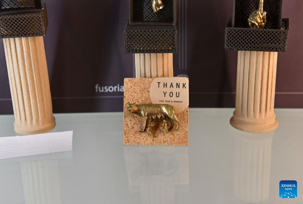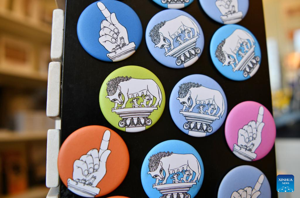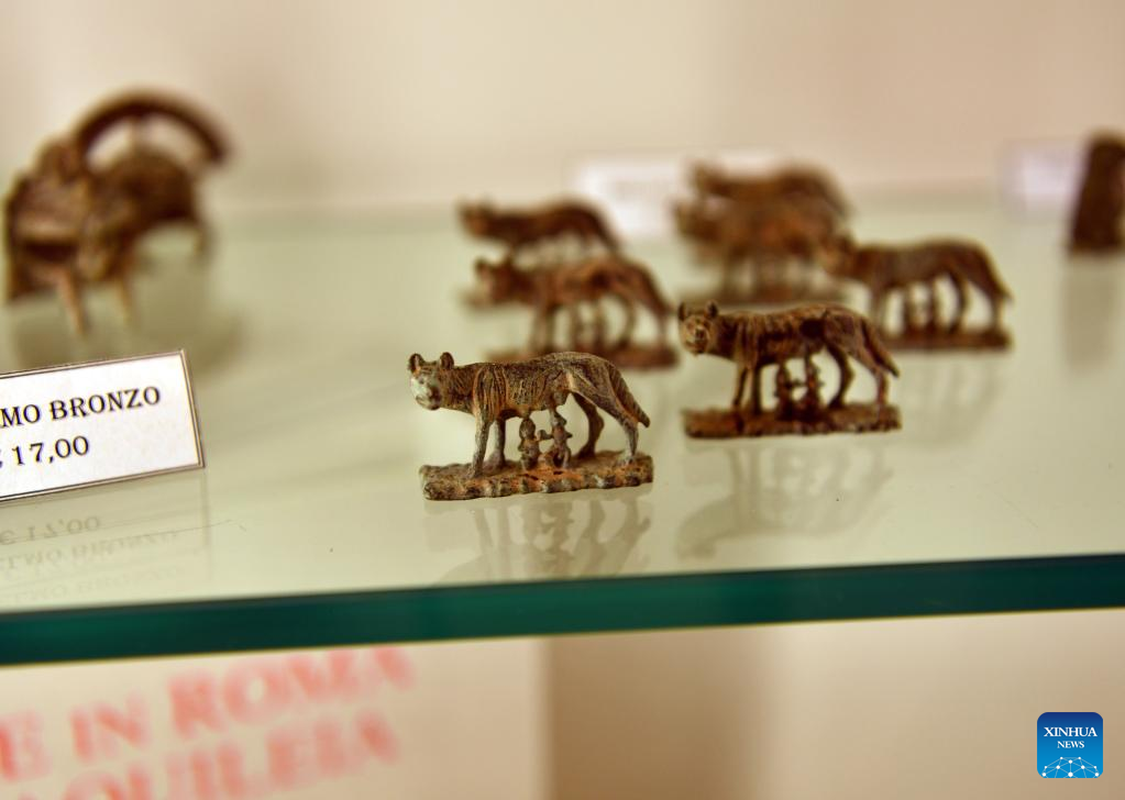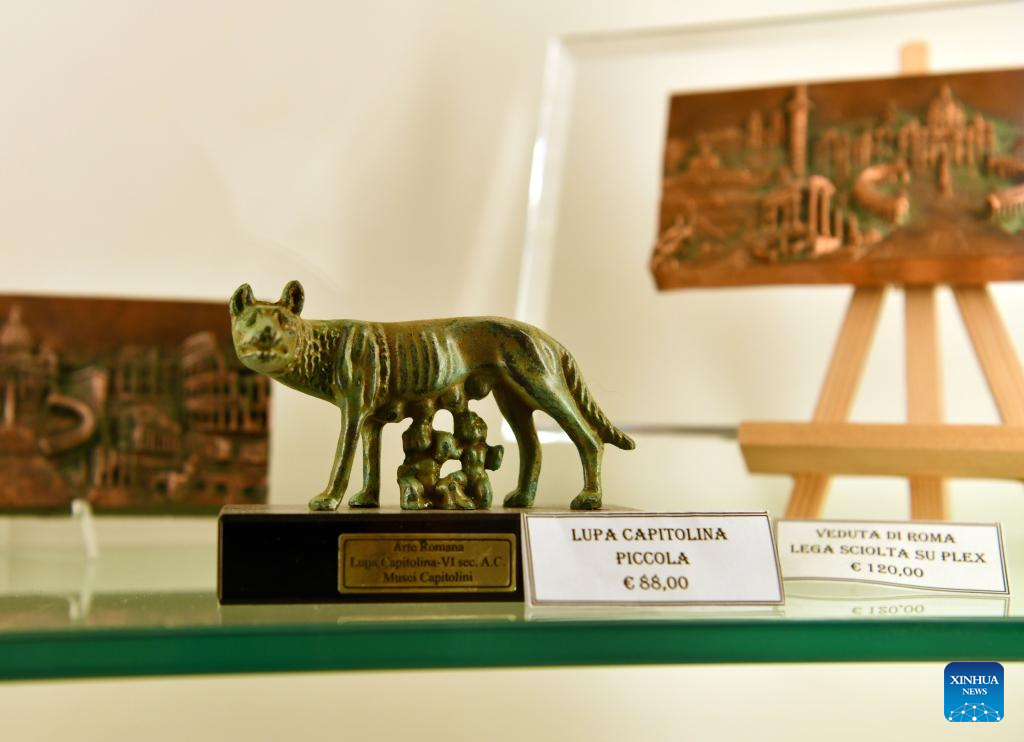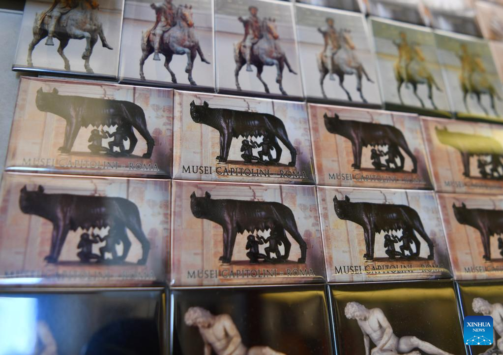 Souvenirs featuring "She-Wolf" are seen in the Capitoline Museums in Rome, Italy, May 13, 2022. One of the prestigious collections of the Capitoline Museums is the "She-Wolf", a masterpiece of bronze sculpture based on the legend that contributed the city's origin to the twins Romulus and Remus, who in their infancy had been saved and suckled by a wolf. (Xinhua/Jin Mamengni)