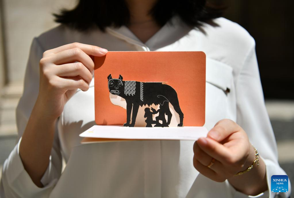 A visitor displays a postcard featuring "She-Wolf" in the Capitoline Museums in Rome, Italy, May 13, 2022. One of the prestigious collections of the Capitoline Museums is the "She-Wolf", a masterpiece of bronze sculpture based on the legend that contributed the city's origin to the twins Romulus and Remus, who in their infancy had been saved and suckled by a wolf. (Xinhua/Jin Mamengni)