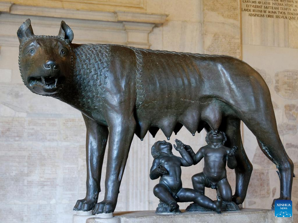 A jewelry featuring "She-Wolf" is seen in the Capitoline Museums in Rome, Italy, May 13, 2022. One of the prestigious collections of the Capitoline Museums is the "She-Wolf", a masterpiece of bronze sculpture based on the legend that contributed the city's origin to the twins Romulus and Remus, who in their infancy had been saved and suckled by a wolf. (Xinhua/Jin Mamengni)