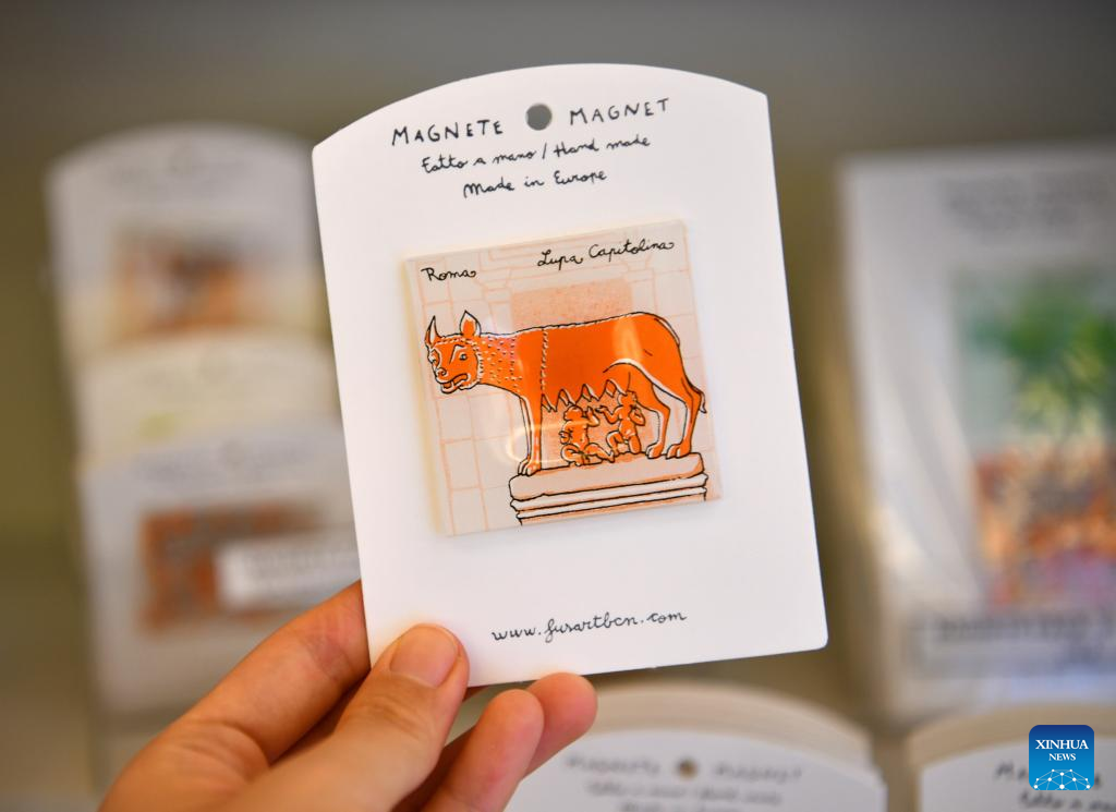 Magnets featuring "She-Wolf" are seen in the Capitoline Museums in Rome, Italy, May 13, 2022. One of the prestigious collections of the Capitoline Museums is the "She-Wolf", a masterpiece of bronze sculpture based on the legend that contributed the city's origin to the twins Romulus and Remus, who in their infancy had been saved and suckled by a wolf. (Xinhua/Jin Mamengni)