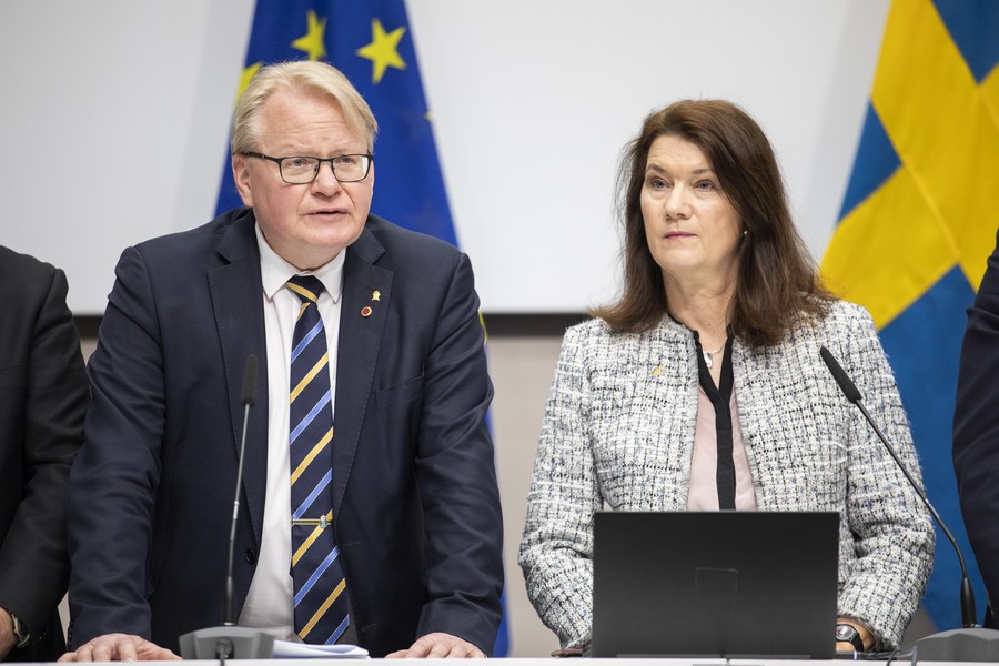 Swedish Foreign Minister Ann Linde (R) and Minister of Defense Peter Hultqvist attend a press conference on a security analysis in Stockholm, Sweden, on May 13, 2022. (Ninni Andersson/Government Offices of Sweden/Handout via Xinhua)
