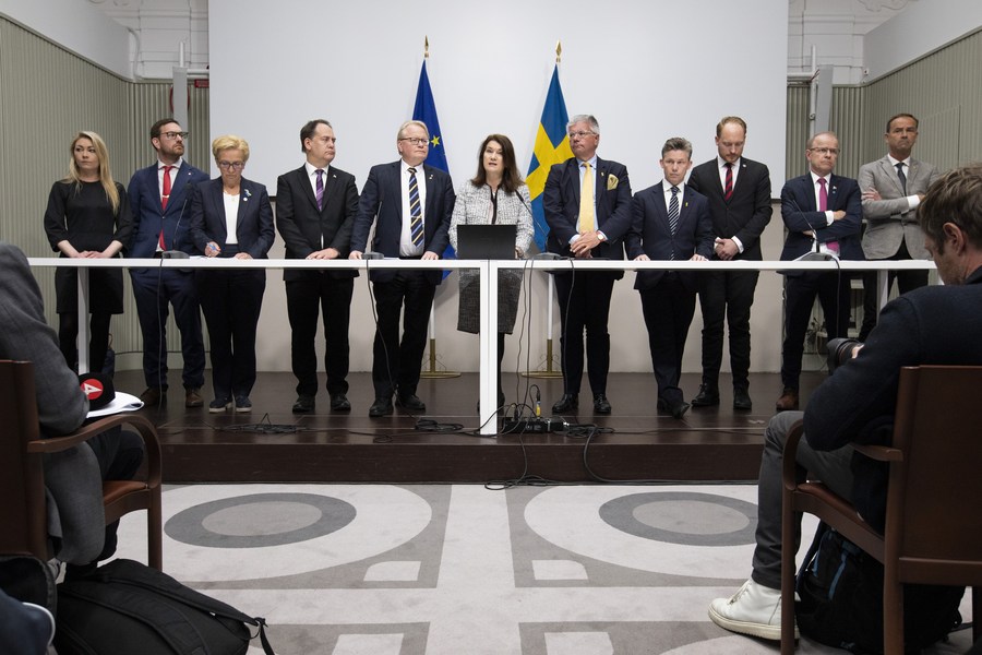 Swedish Foreign Minister Ann Linde (6th L), Minister of Defense Peter Hultqvist (5th L) and other parliamentary party representatives present the result of a security analysis at a press conference in Stockholm, Sweden, on May 13, 2022. (Ninni Andersson/Government Offices of Sweden/Handout via Xinhua)
