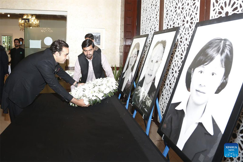 Pakistani Foreign Minister Bilawal Bhutto Zardari (L) pays his tribute to the Chinese victims of the terrorist attack during a memorial service in Islamabad, capital of Pakistan on May 14, 2022. The Pakistani Foreign Ministry on Saturday held a memorial service for the Chinese teachers killed in the terrorist attack at the Confucius Institute of the University of Karachi. (Photo by Ahmad Kamal/Xinhua)