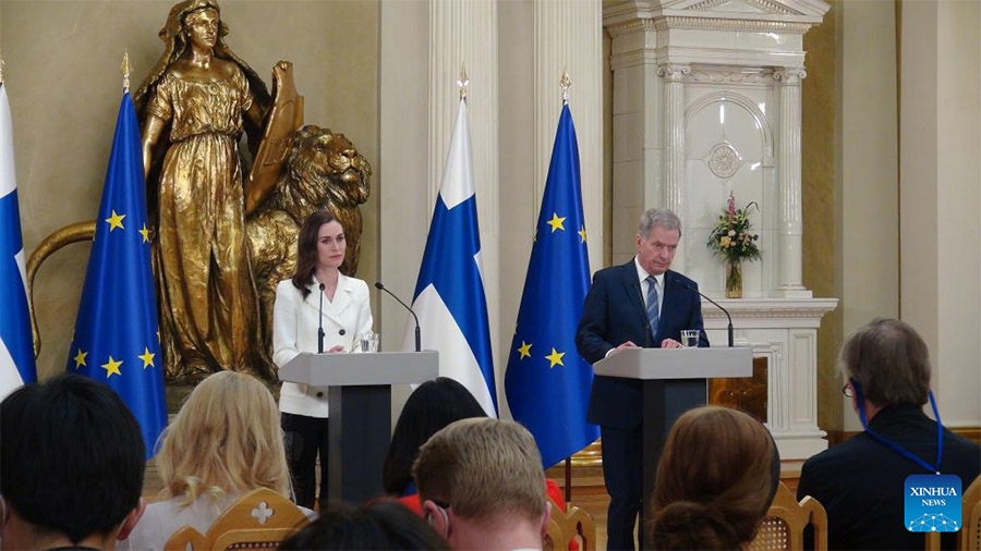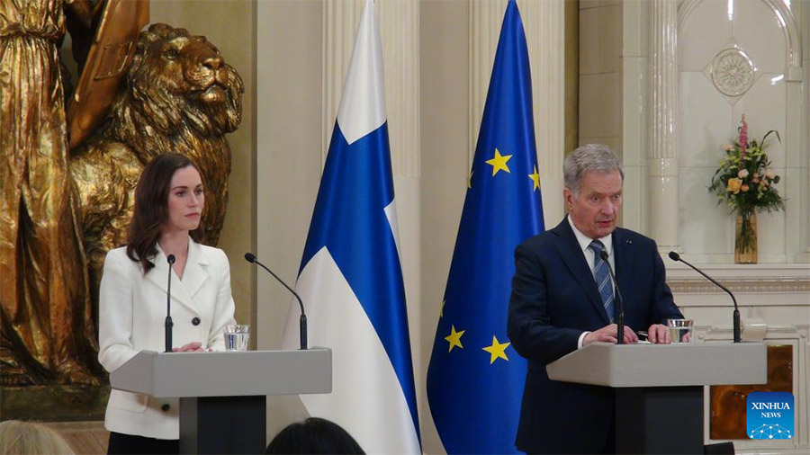 Finland's President Sauli Niinisto (R) and Prime Minister Sanna Marin attend a joint press conference in Helsinki, Finland, May 15, 2022. Finland's president and the government's foreign policy committee on Sunday took the official decision to start the process of the country's application to become a member of the North Atlantic Treaty Organization (NATO). (Xinhua/Chen Jing)