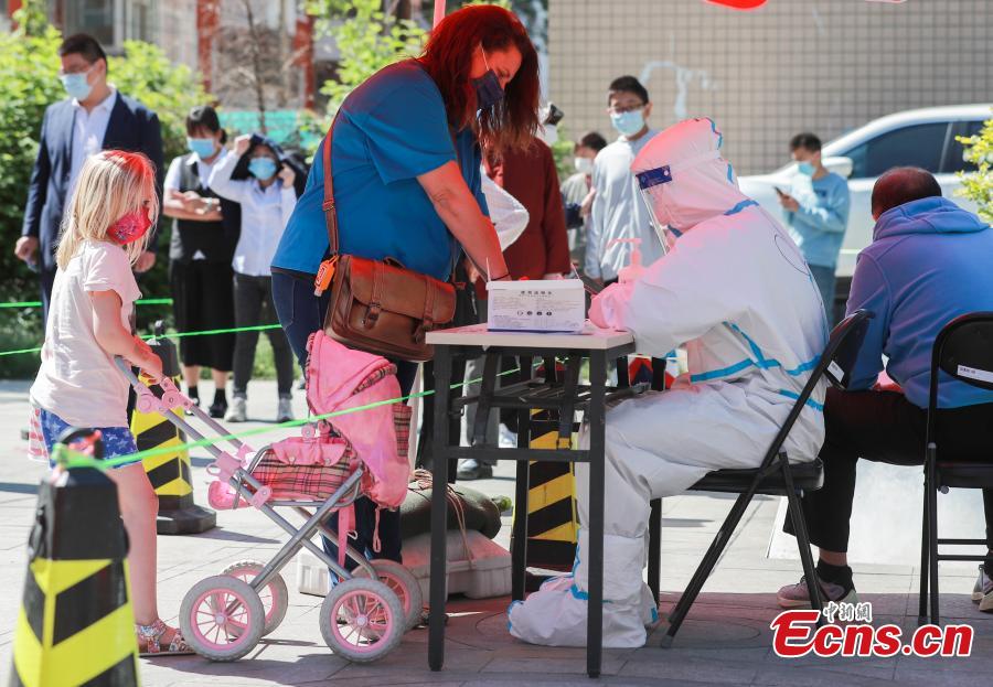 A medical staff member helps foreign nationals register information for nucleic acid testing at Sanlitun area, Chaoyang district, Beijing, May 15, 2022. (Photo: China News Service/Jia Tianyong)