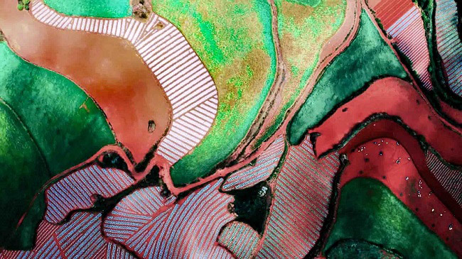Reddish-hued soils of Yunnan form natural "color palette" as highland barley crops ripen