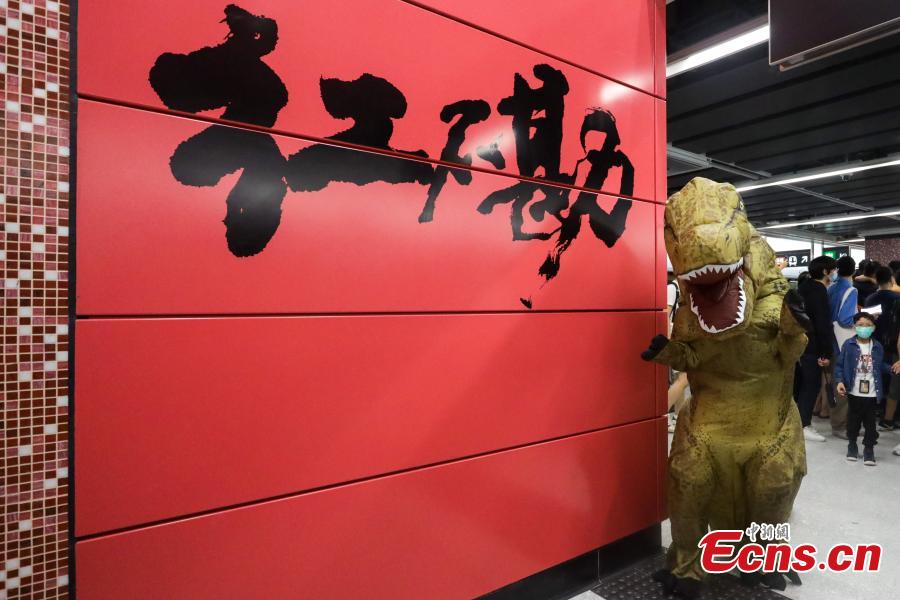 A citizen wearing a dinosaur costume takes photos at the platform of Hung Hom station, the Hong Kong Special Administrative Region, May 15, 2022. (Photo: China News Service/Chen Yongnuo)