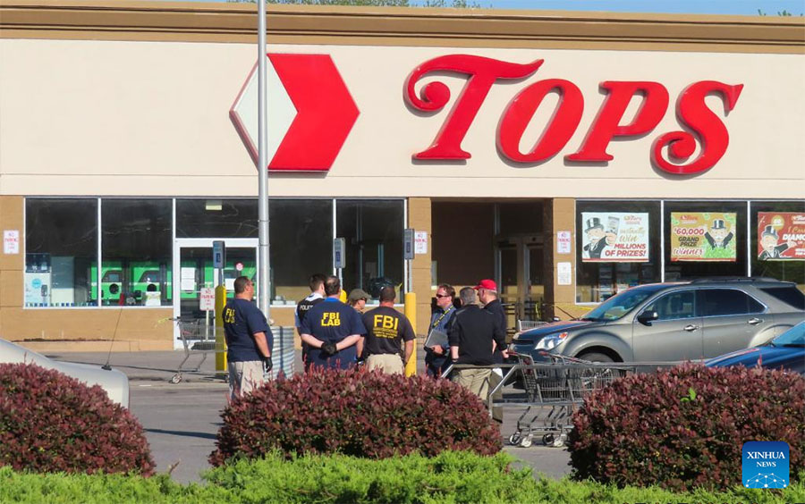 Investigators work at the site of a mass shooting in Buffalo of New York State, the United States, May 15, 2022. An 18-year-old U.S. white man was arraigned on Saturday night hours after shocking the nation by live-streaming his mass shooting at a supermarket in the city of Buffalo. (Photo by Xinhua)