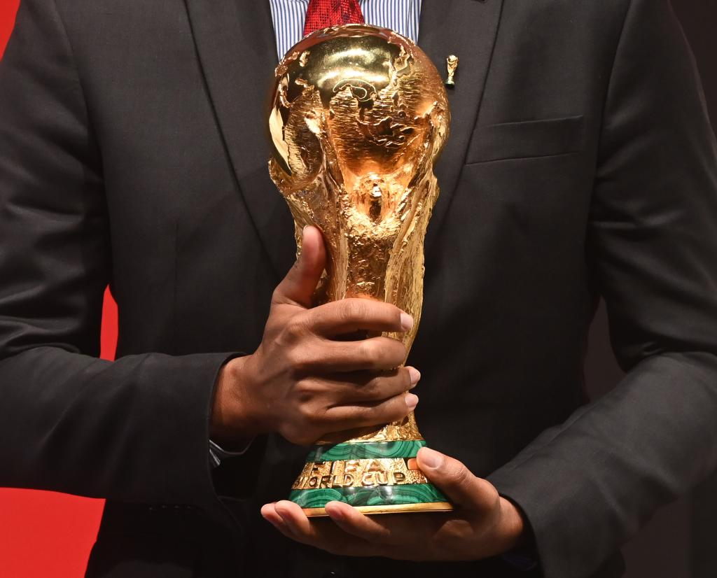 Brazilian former soccer player Gilberto Silva displays the World Cup trophy during a FIFA World Cup Trophy Tour event in Kuwait City, Kuwait, May 16, 2022. (Xinhua)