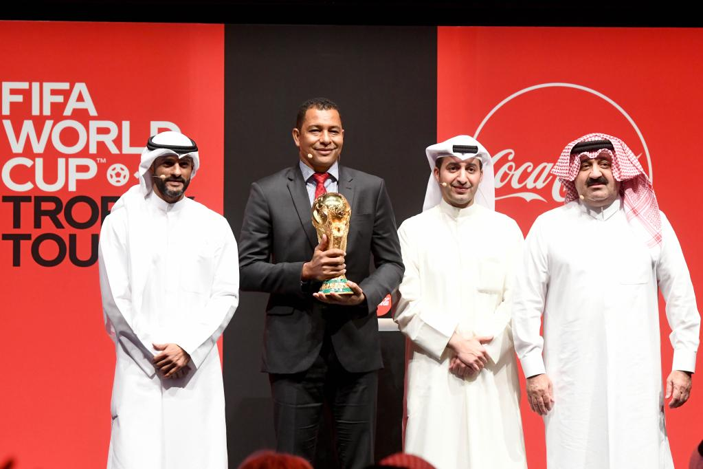 Brazilian former soccer player Gilberto Silva (2nd L) displays the World Cup trophy during a FIFA World Cup Trophy Tour event in Kuwait City, Kuwait, May 16, 2022. (Xinhua)